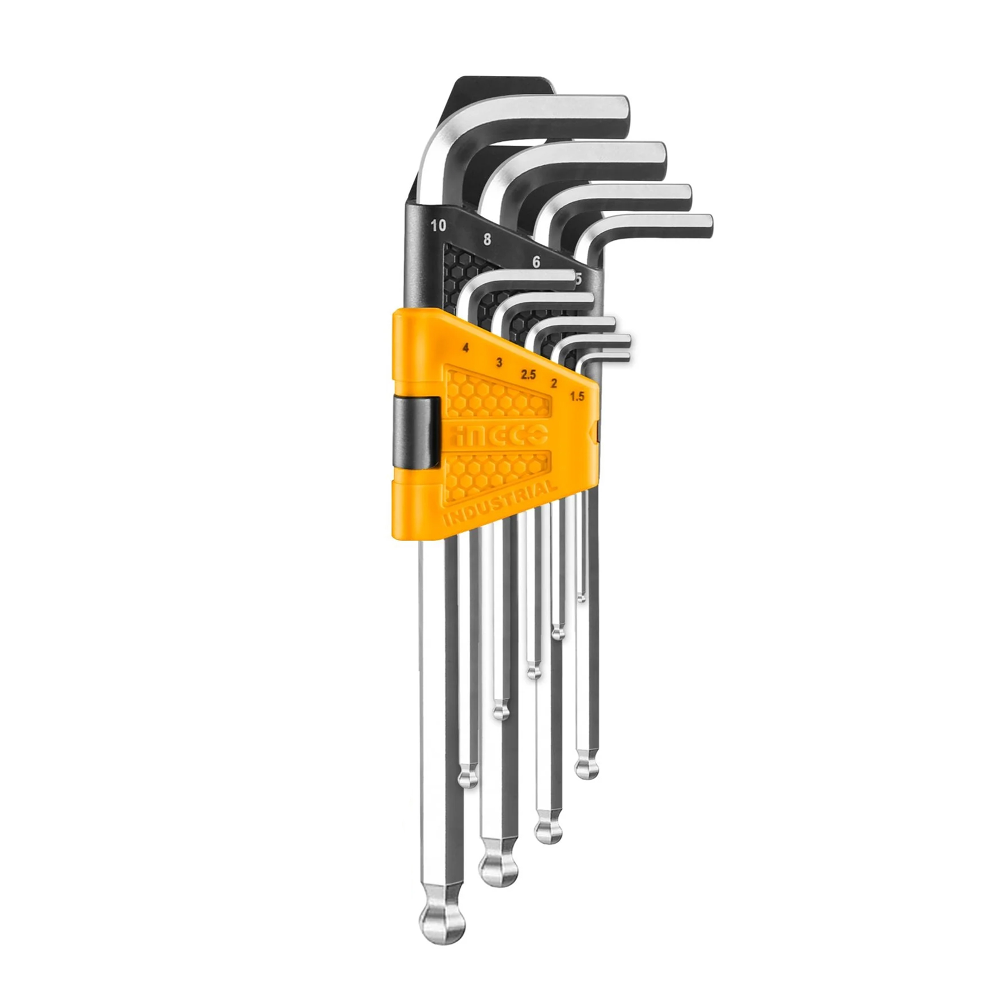 The Ingco HHK12091 Ball-End Allen Key Set is an essential tool for tightening and loosening hex bolts. The set includes 9 wrenches of varying sizes: 1.5 mm, 2 mm, 2.5 mm, 3 mm, 4 mm, 5 mm, 6 mm, 8 mm, and 10 mm. These wrenches are made of high-quality materials for strength and durability. The ball-end allows for better access to bolts at awkward angles.