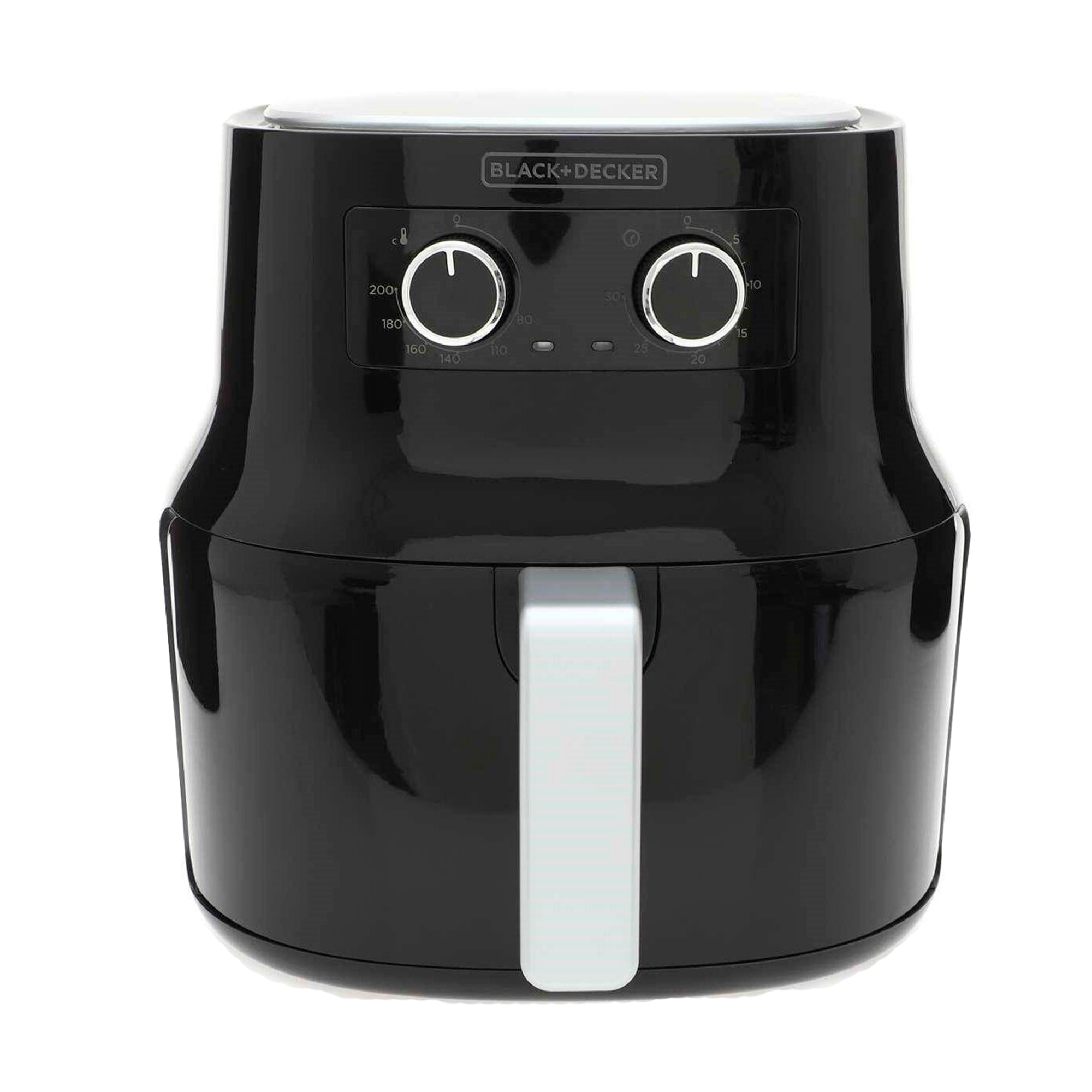 4.5 liter air fryer, temperature control of 200° Celsius, 30 min automatic timer, removable non-stick coated basket, cool touch handle, dishwasher safe parts, voltage 110, frequency 60Hz.