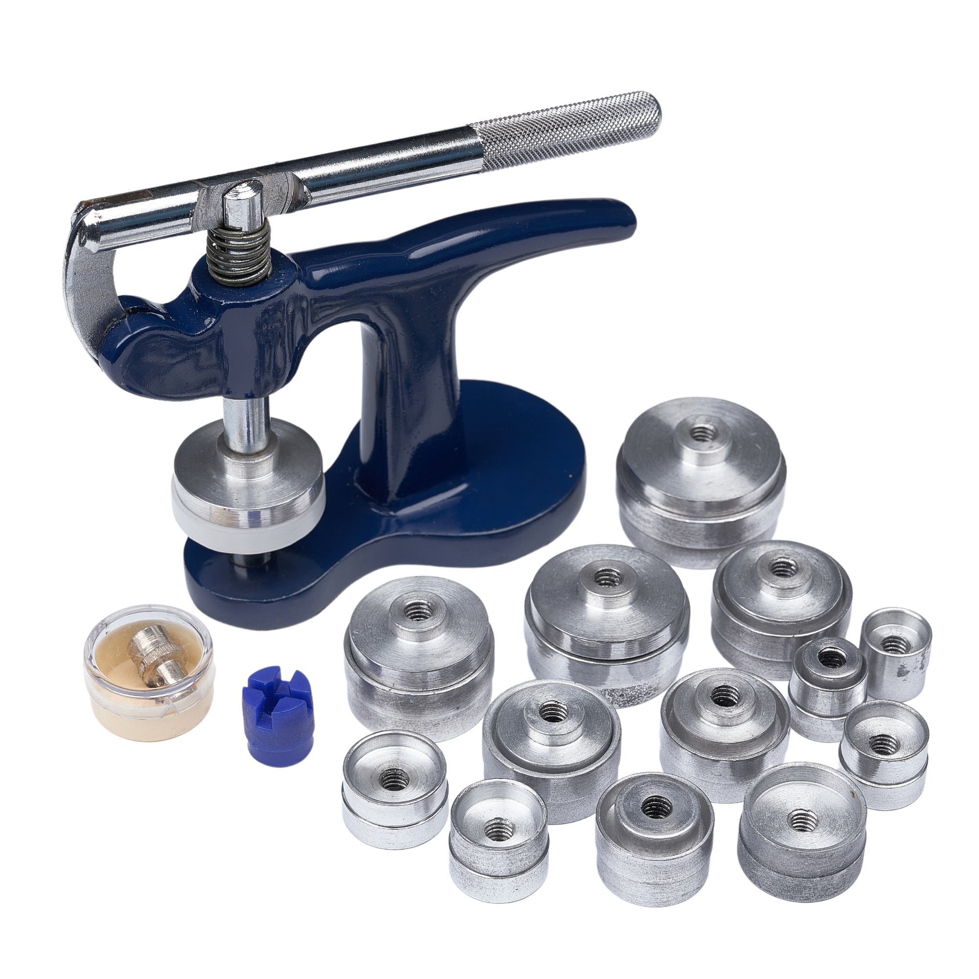 Multifunctional Watch Back Case Backing and Glass Mounting Machine, 13 Deep Aluminum Dies, 18mm-46mm, 4 Plastic Dies for Square Watch Cases, Multi-Purpose Chain Link Remover Accessory: This multifunctional machine is an indispensable tool for watch repairs. It includes 13 deep aluminum dies, from 18mm to 46mm, and 4 plastic dies for square watch cases.