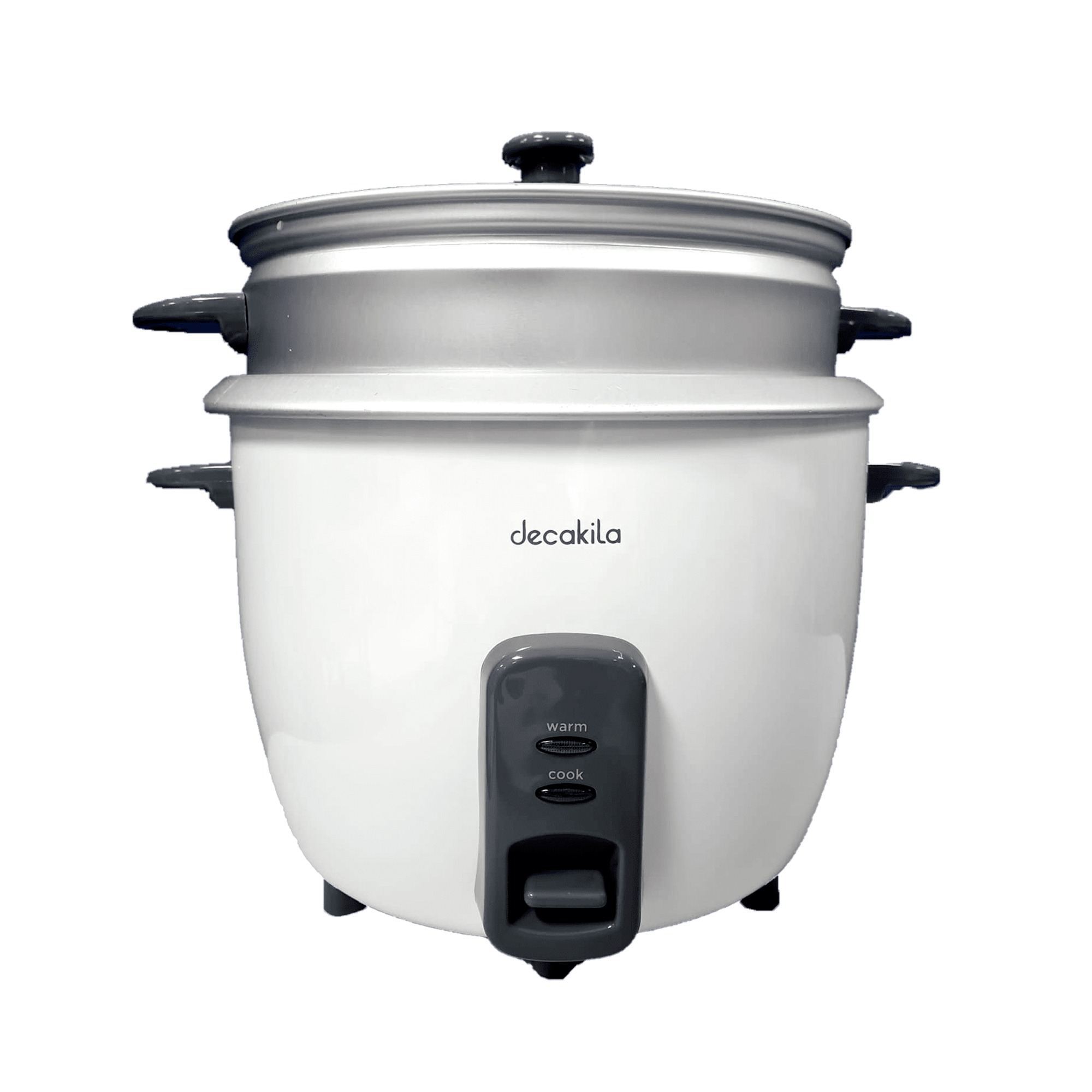 1.8 liter rice cooker, glass lid, power and function lights, threaded heating plate, 120v voltage, 60 Hz frequency, 700 watts power, includes measuring cup and plastic spoon.
