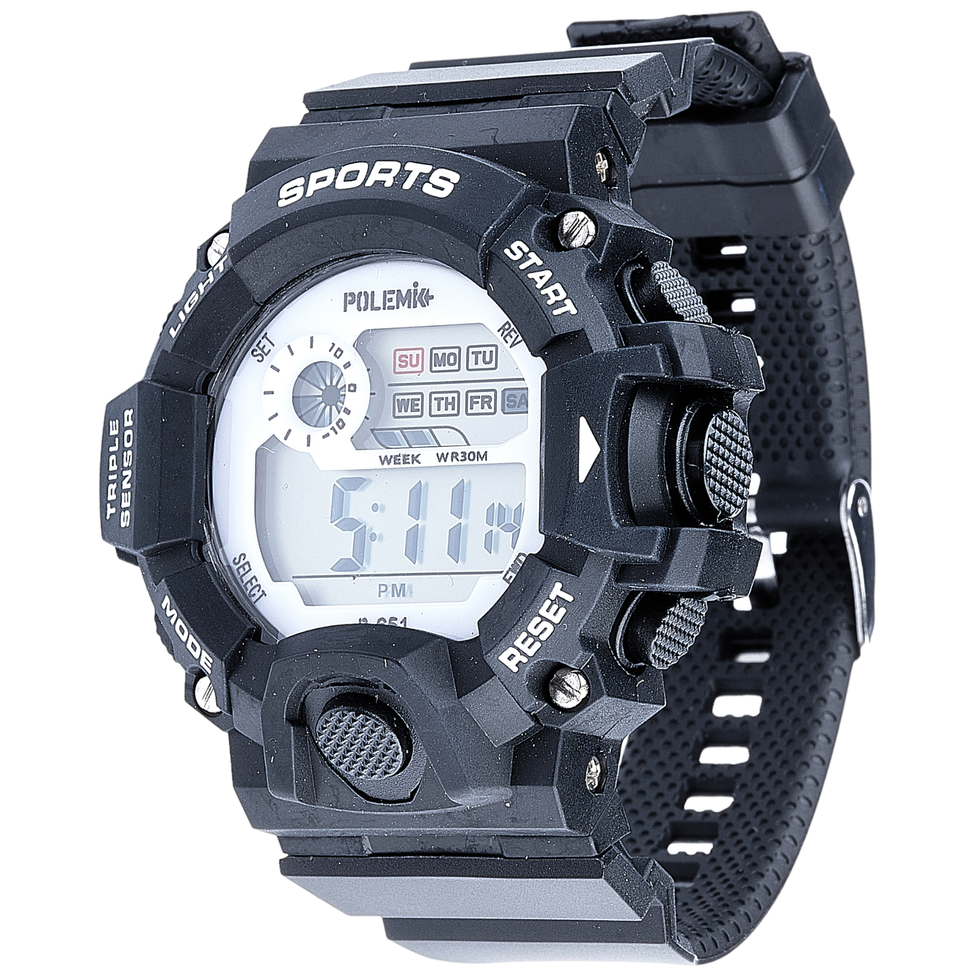 Waterproof alarm, stopwatch, date, day.