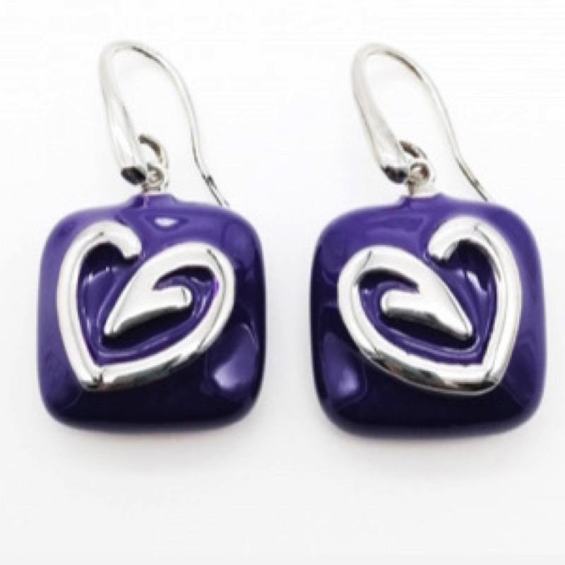 Enamel earrings with a square design and a heart in the center, a modern touch. Hook closure.